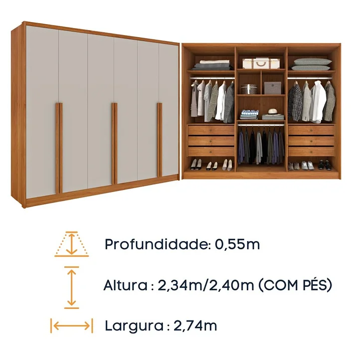 Com Guarda Roupa Casal Realeza o quarto fica mais aconchegante, com visual robusto e estrutura eficiente. Você terá sempre suas roupas e acessórios organizados. Possui 6 Portas e 6 Gavetas bem distribuídas. É o item perfeito para seu ambiente! Tamanho do produto montado: – Altura: 234cm | Largura: 274cm | Profundidade: 55cm. Produto em MDF, gavetas com corrediças telescópicas e puxadores em PVC, puxadores das portas em MDF e cabideiros feitos de alumínio. Possui 4 dobradiças de 26mm por porta, distanciadores das gavetas em MDF, coluna laterais em MDF de 25mm. Não possui espelho. A montagem do produto é de total responsabilidade do comprador.Atenção: a tonalidade da cor pode variar de acordo com o lote do fabricante; e/ou as configurações de seu monitor. Imagens meramente ilustrativas: os objetos que ambientam as fotos não acompanham o produto. Contém 1 unidade do produto anunciado.
